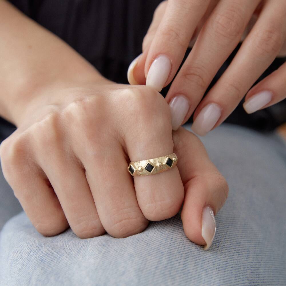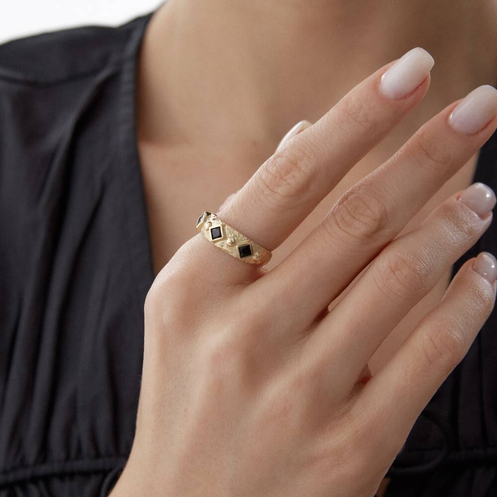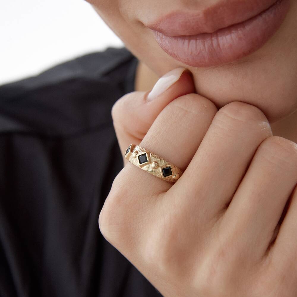 Altın Siyah Taşlı Geometrik Luna Yüzük