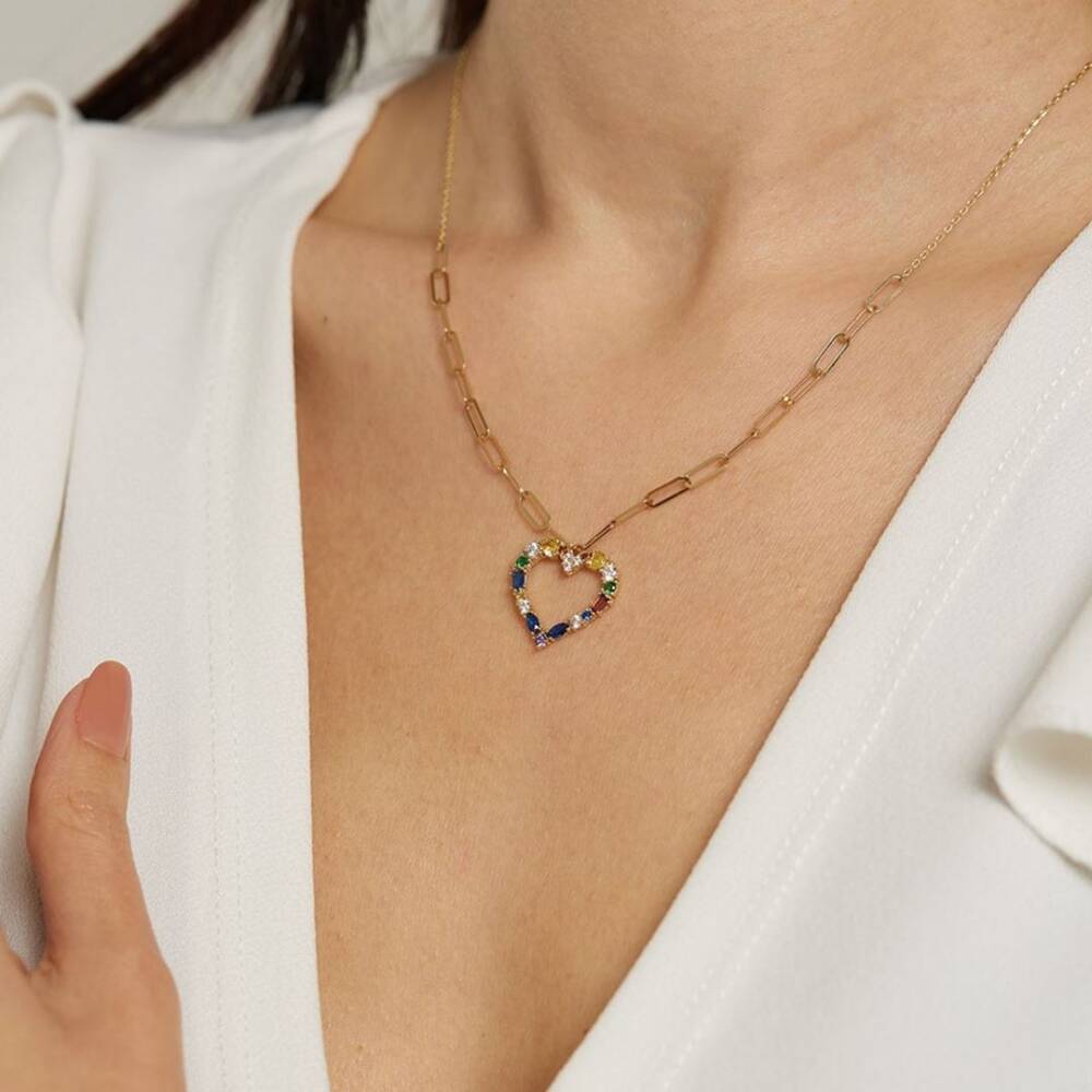 Ataş Zincirli Renkli Taşlı Kalp Altın Kolye - 1