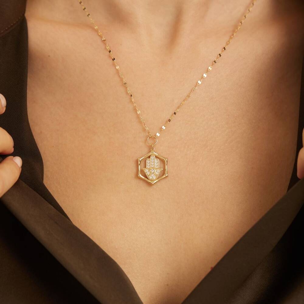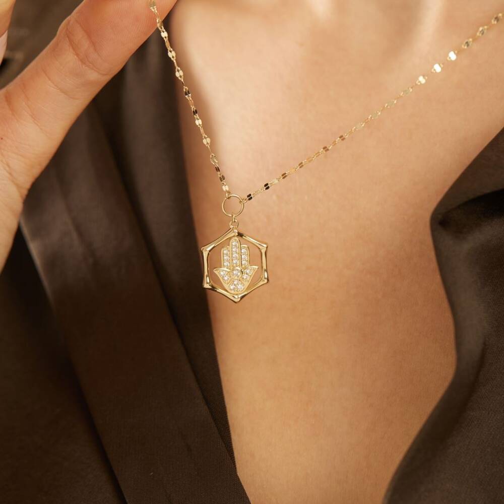 Aynalı Zincirli Taşlı Fatma Ana Eli Altın Kolye - 1