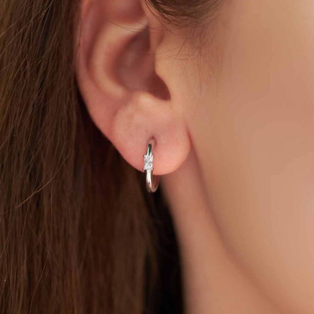 Baget Taşlı Beyaz Altın Halka Küpe - 1
