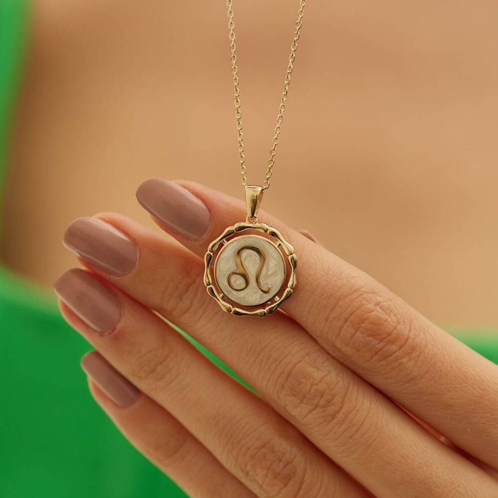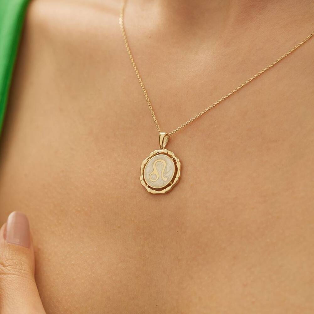 Beyaz Mineli Aslan Burcu Altın Kolye - 1
