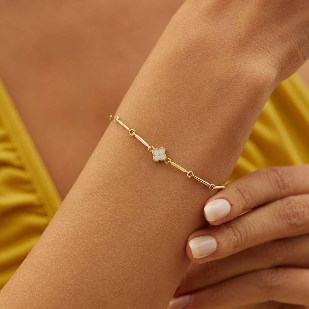 Beyaz Mineli Minimal Yonca Altın Bileklik - 1