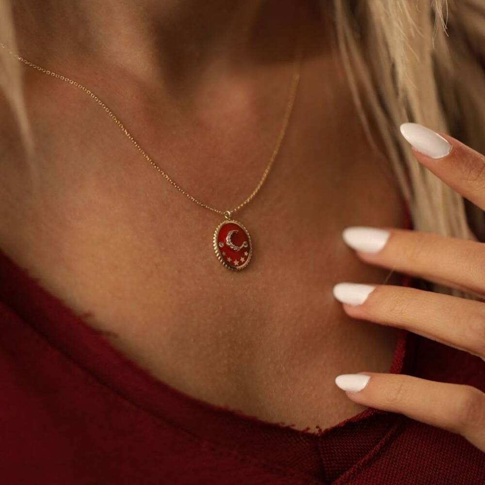 Kırmızı Mineli Ay Yıldız Altın Kolye
