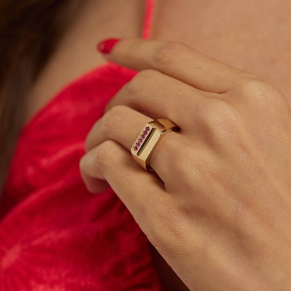 Kırmızı Taşlı Plaka Altın Yüzük