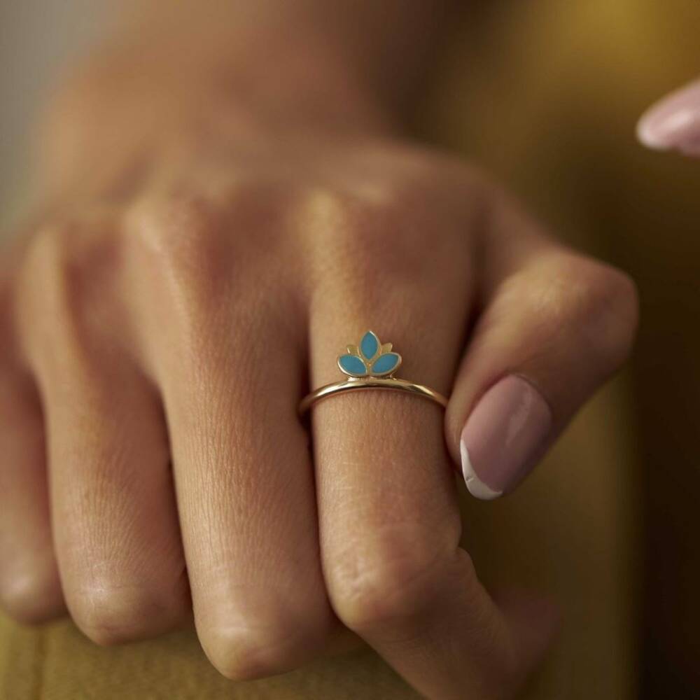Mavi Mineli Lotus Çiçeği Minimal Altın Yüzük - 1