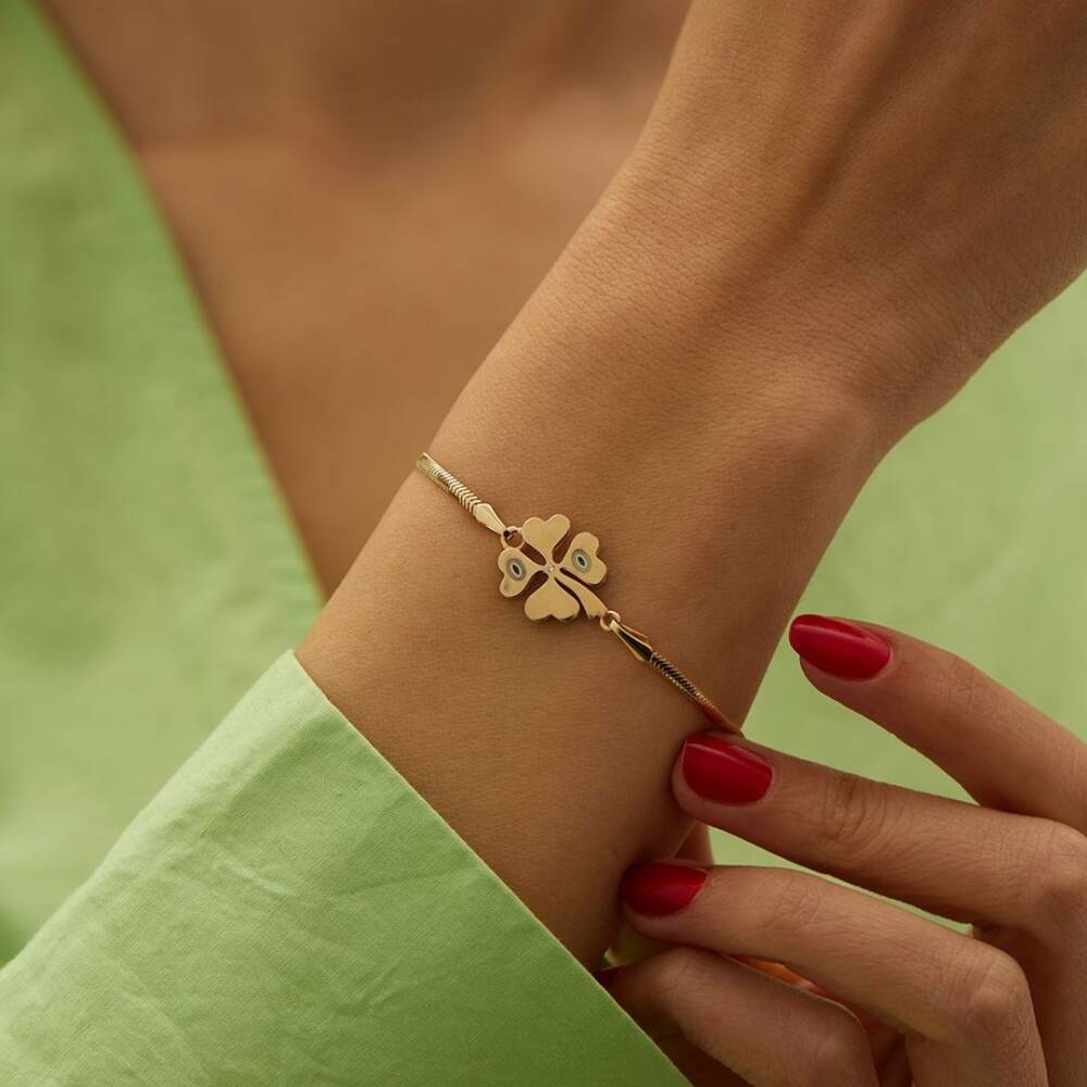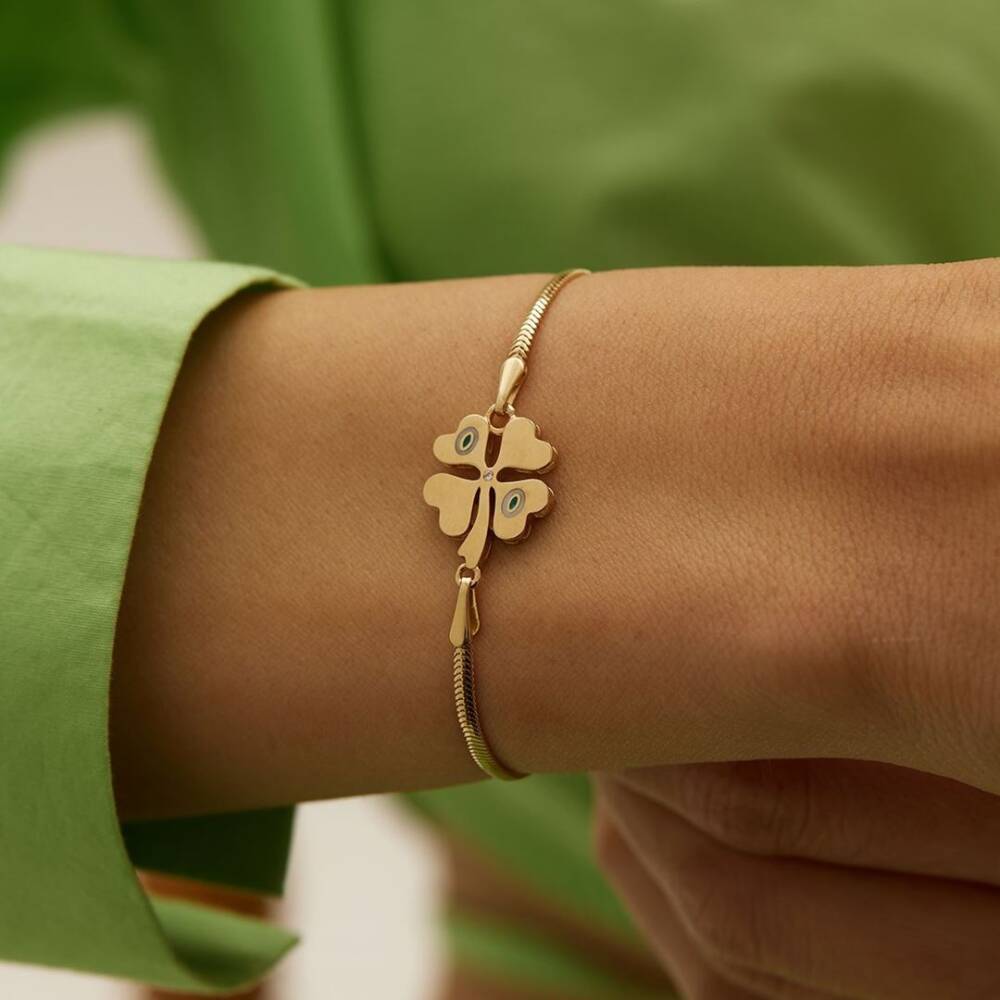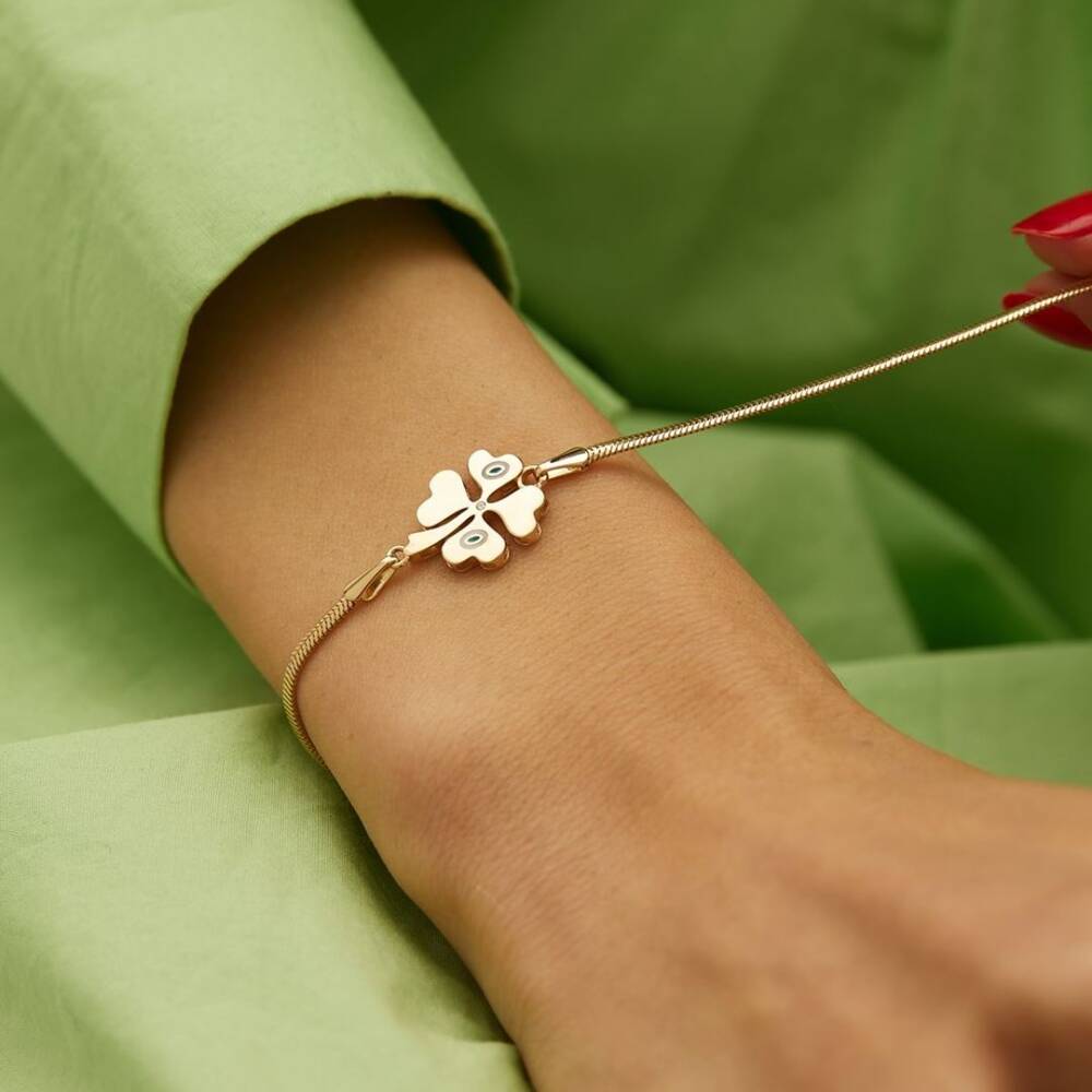 Nazar Boncuklu Yoncalı Balıksırtı Zincir Altın Bileklik
