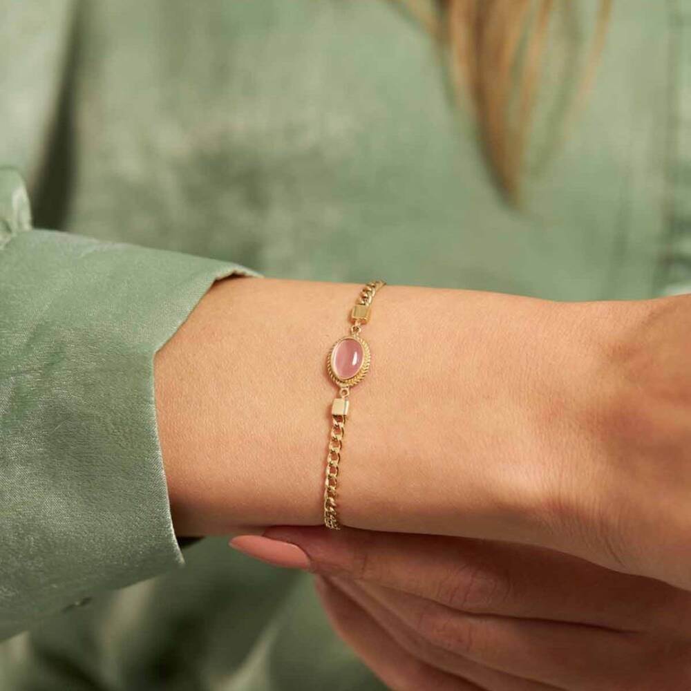 Oval Pembe Taşlı Gurmet Zincir Altın Bileklik