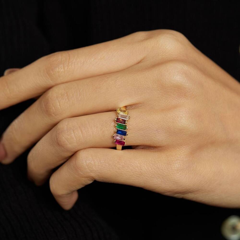 Renkli Baget Taşlı Minimal Altın Yüzük