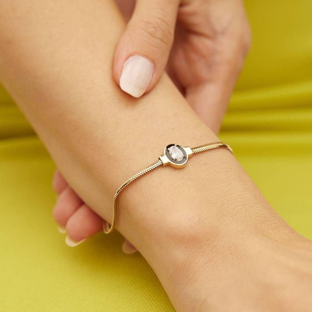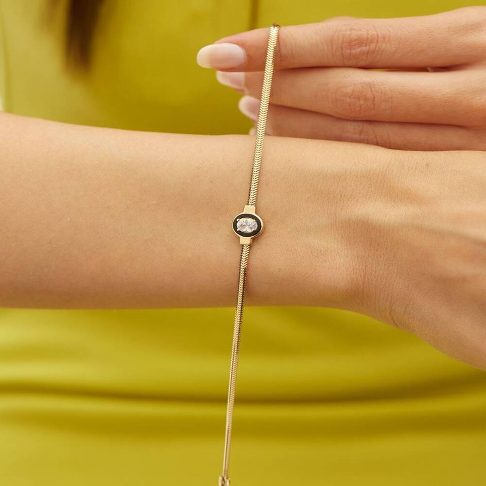 Siyah Mineli Oval Baget Taşlı Balıksırtı Zincir Altın Bileklik - 2