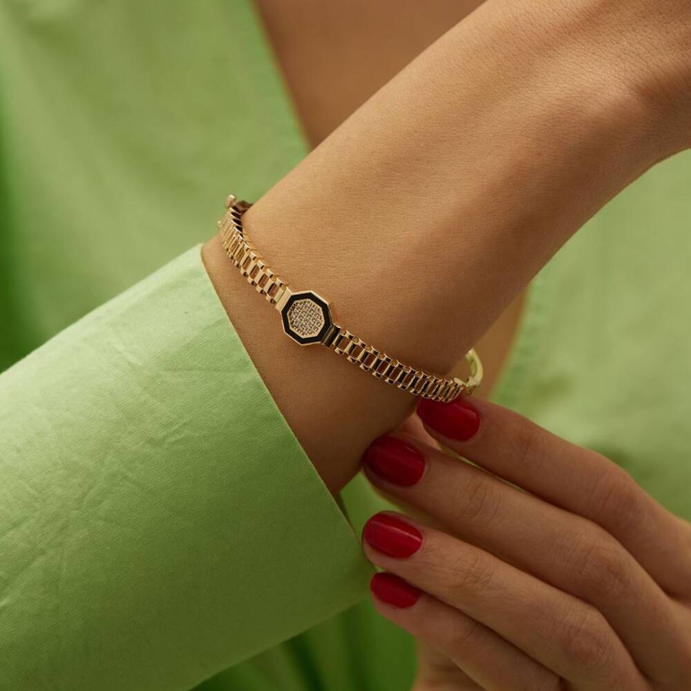 Siyah Mineli Taşlı Kemer Tasarım Altın Kelepçe Bilezik - 1