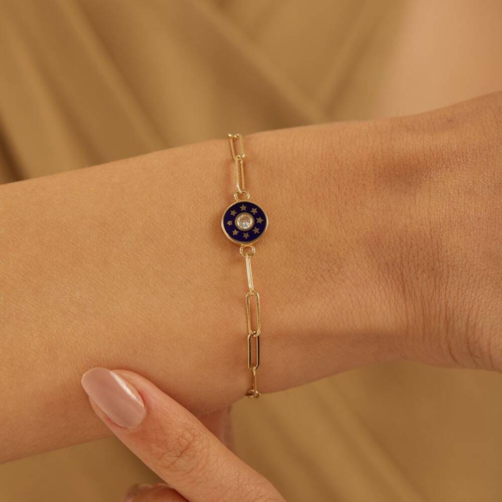 Siyah Mineli Yıldız Detaylı Ataş Zincir Altın Bileklik - 1