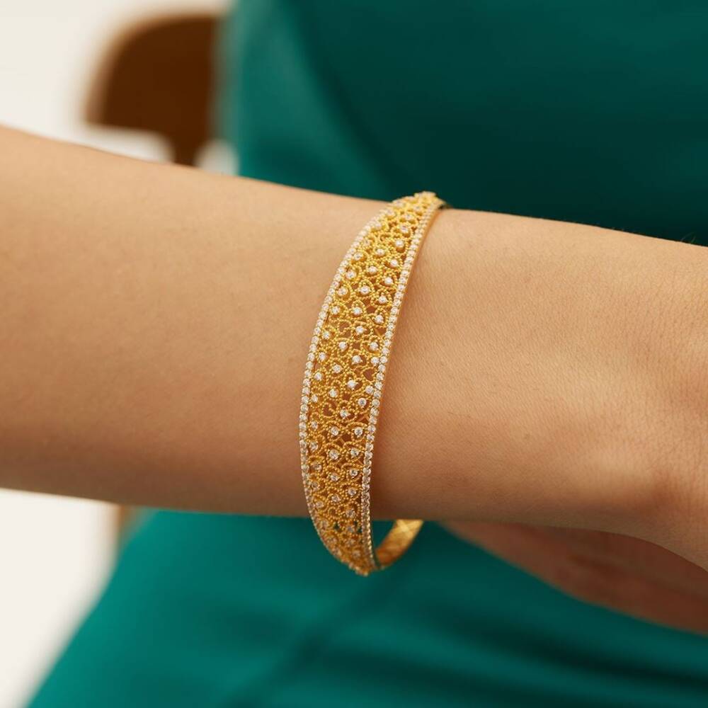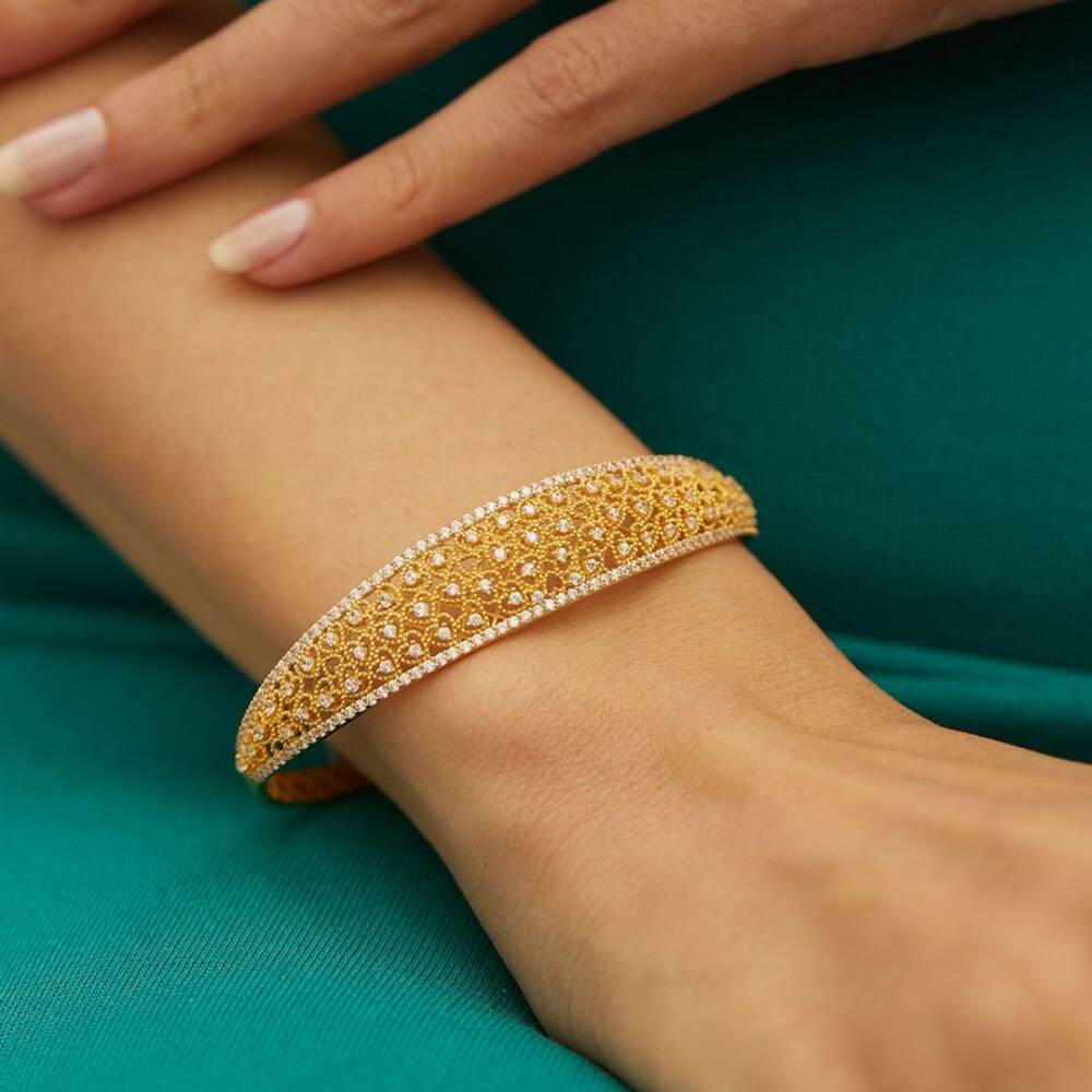 Taşlı Kalp Detaylı Altın Kelepçe Bilezik