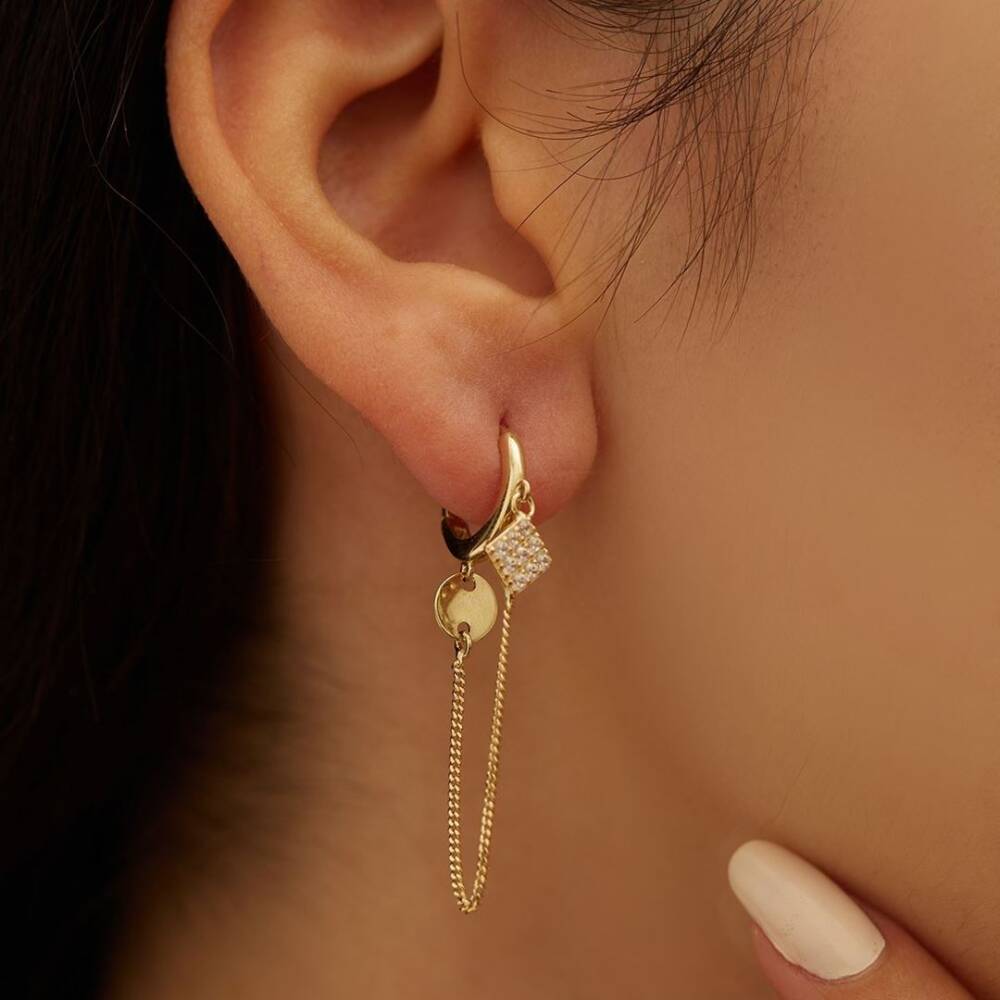 Taşlı Kare Tasarımlı Sallantılı Altın Küpe - 1