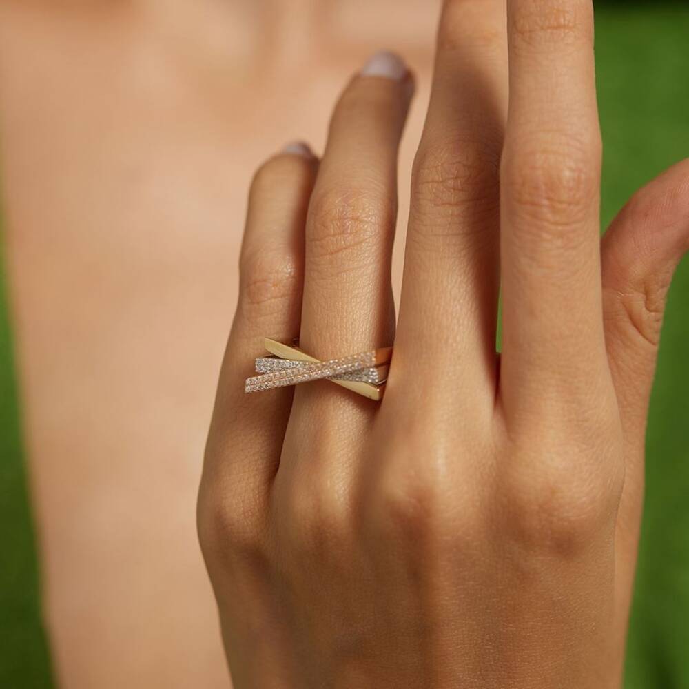 Üç Renkli Taşlı Zikzak Altın Yüzük - 1