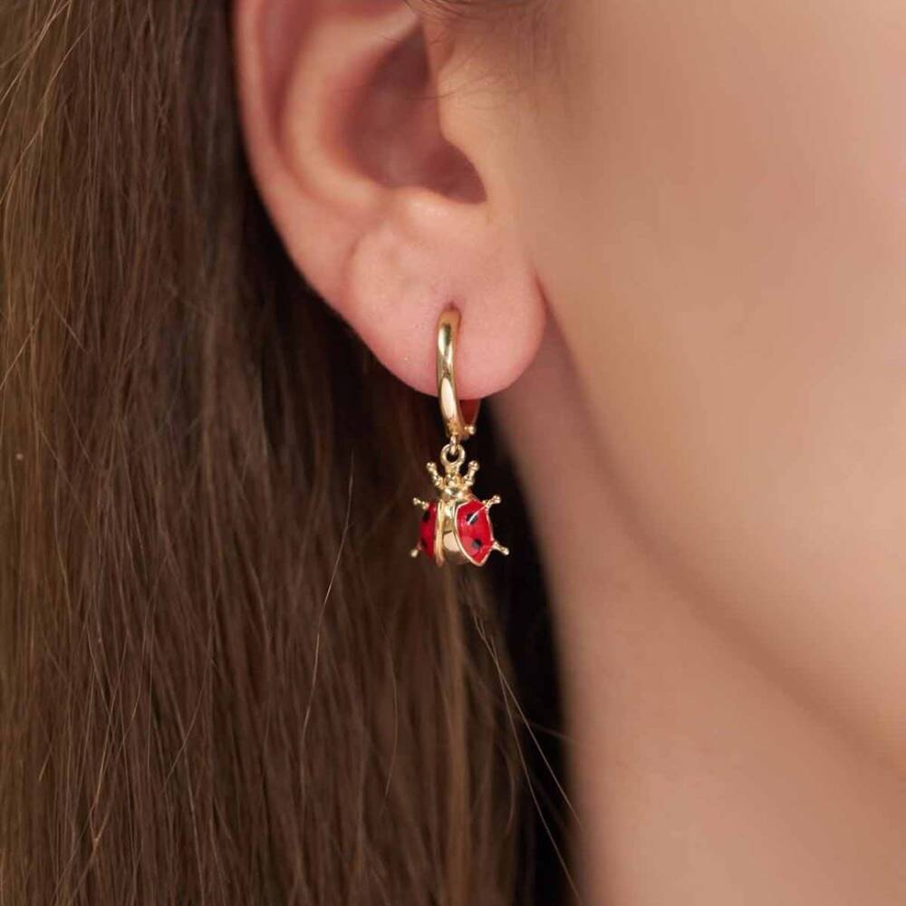 Uğur Böceği Sallantılı Halka Altın Küpe - 1