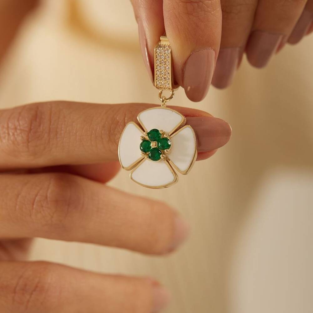 Yeşil Taşlı Beyaz Mineli Çiçek Altın Kolye Ucu