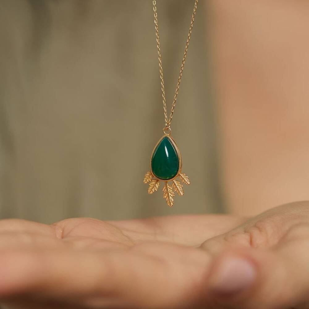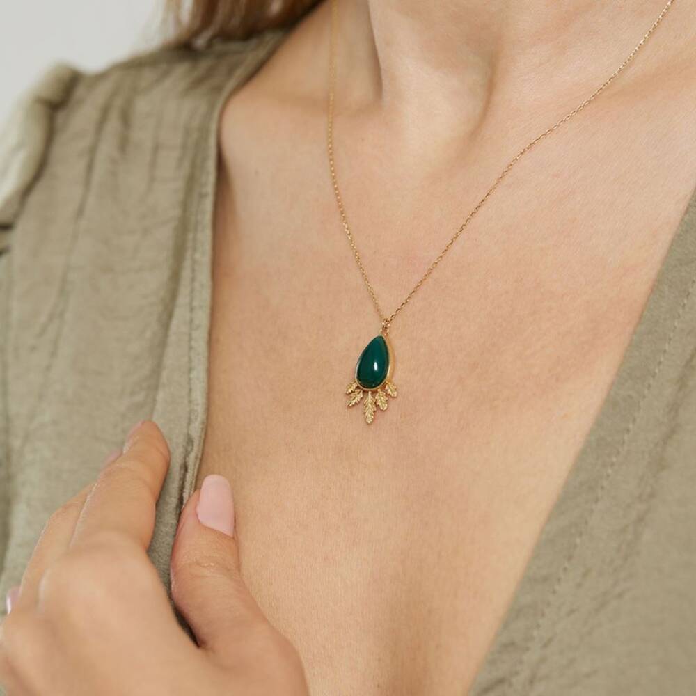 Yeşil Taşlı Damla Altın Kolye - 1