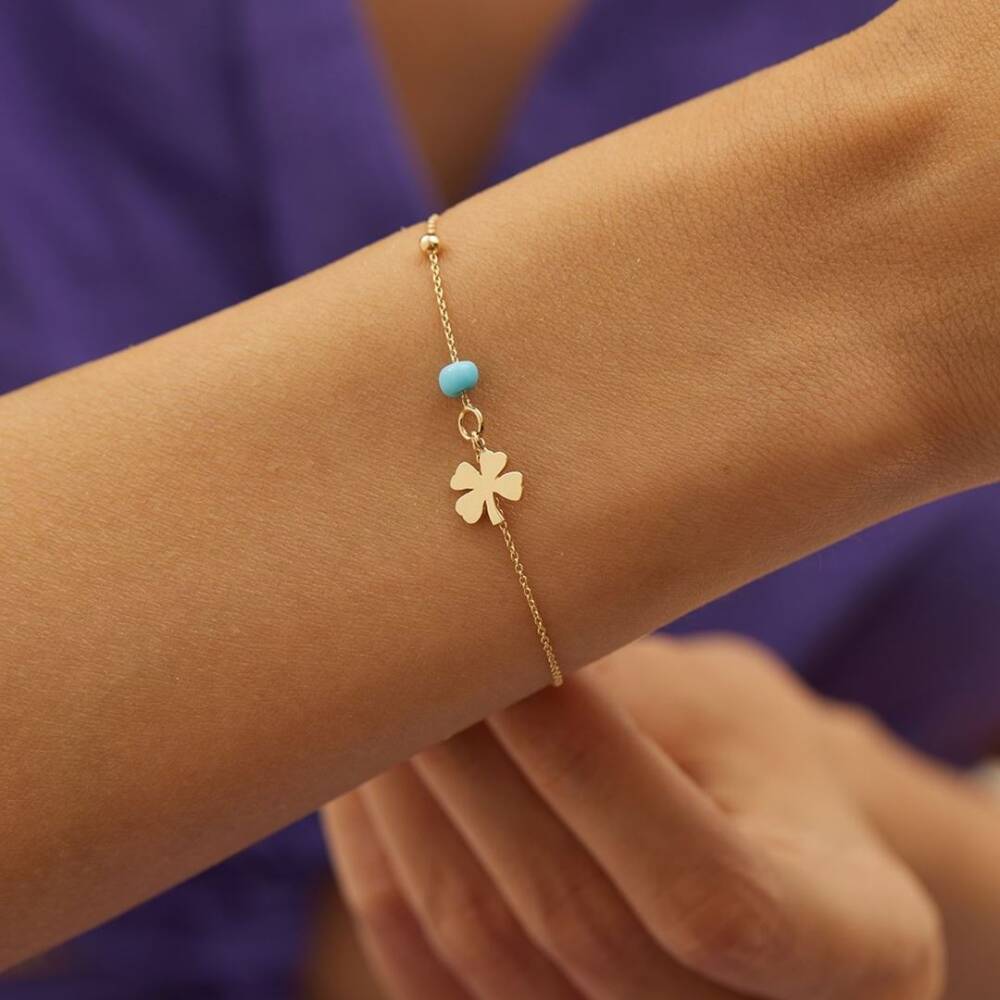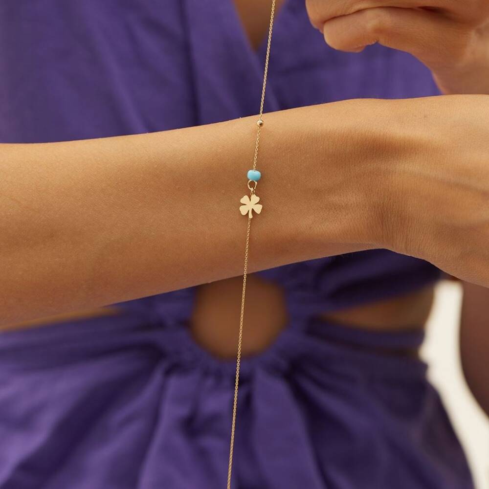 Yoncalı Turkuaz Boncuklu Minimal Altın Bileklik - 1