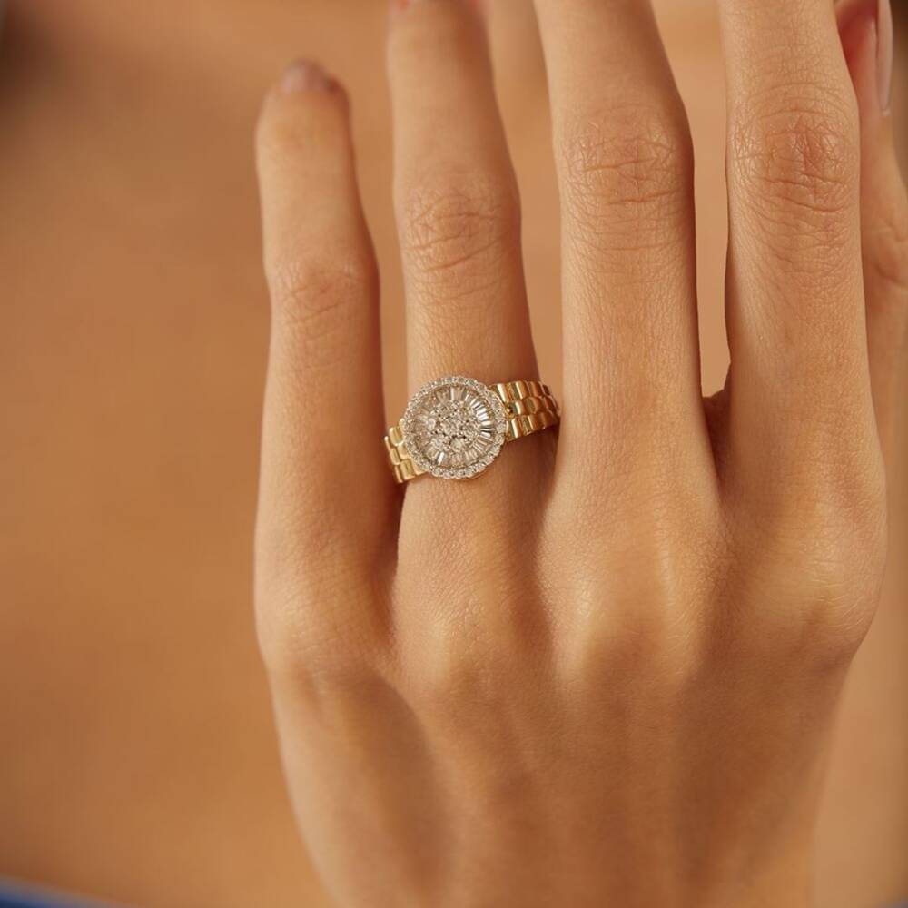 Yuvarlak Baget Taşlı Saat Kordonu Tasarımlı Altın Yüzük - 1